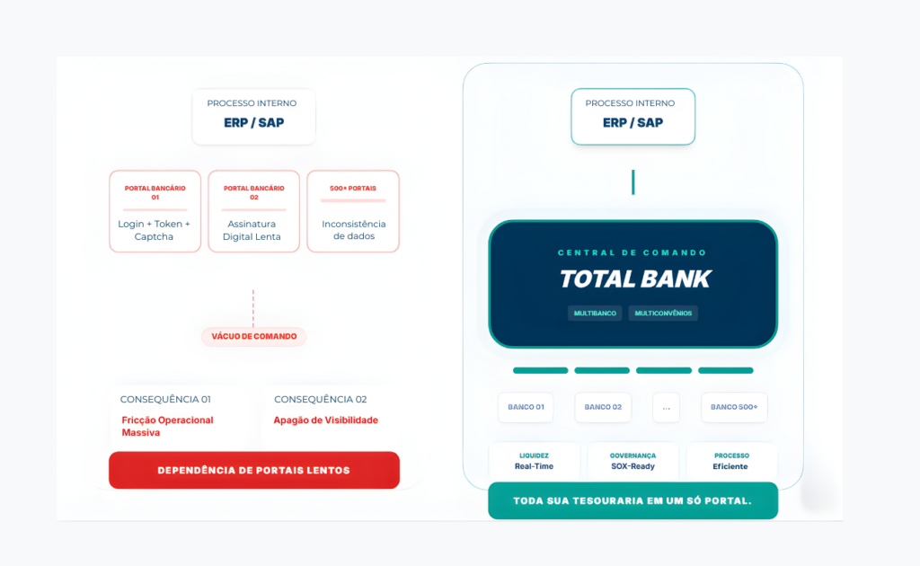 A gestão de 500+ contas através de acessos individuais é um erro de arquitetura financeira. A fragmentação gera um vácuo de informação que compromete a integridade do fluxo de caixa e a agilidade na liquidação de obrigações. Quando a equipa financeira gasta 70% do seu tempo em tarefas de “input” e conciliação de planilhas, o capital intelectual da empresa está sendo desperdiçado em processos que a tecnologia já resolveu.